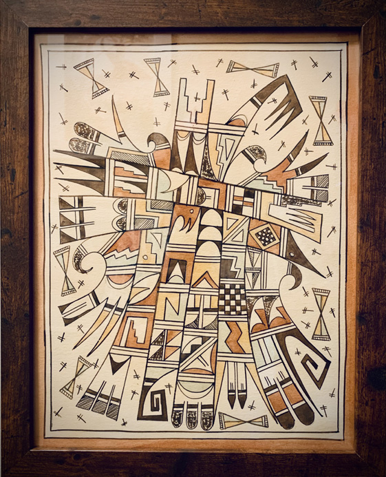 We are always delighted to share the original watercolor work of a popular Hopi artist, Abel Nash. He is a diverse artist who works in a variety of styles and mediums, methods and materials. These watercolors are some of my favorite pieces he has created. They feature a kaleidoscope of stylized pottery symbols and katsina designs. The canvas measures 11” wide and 14” long. Framed it measures 12.5" wide and 15.5" long.