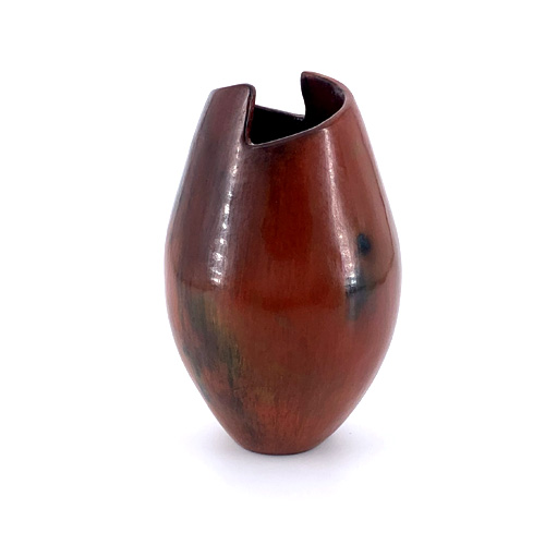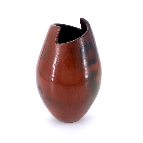 She then fires the pots outside using either juniper or pinion wood. This process gives her pots a beautiful color and fire cloud finish. She then applies a light coating of warm pitch to the warm pots after firing and burnishes that down.