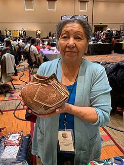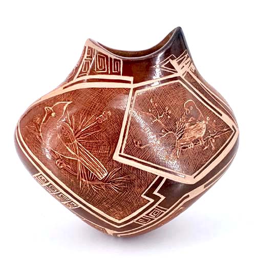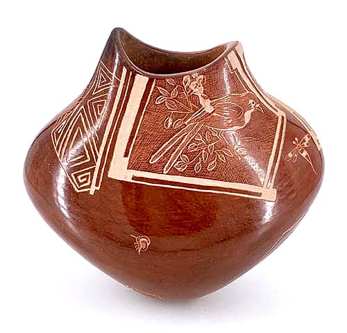 Bernice Naranjo is the mother of Dusty Naranjo, and grandmother of Johnathan Naranjo. She is most known for her dark brown jars decorated with intricate sgraffito designs.