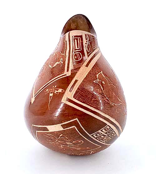 Bernice spent years working out the process to make her trademark sienna/brown jars. It seems they are formed, fired black, etched, then refired to sienna. They have earned her numerous ribbons at the Santa Fe Indian Market, the Heard Museum Guild Indian Art Fair & Market and the Eight Northern Pueblos Arts & Crafts Show.