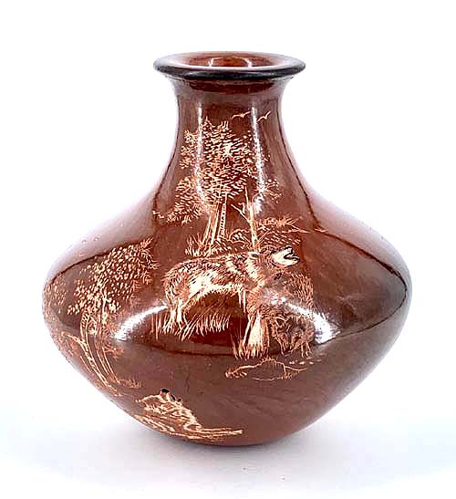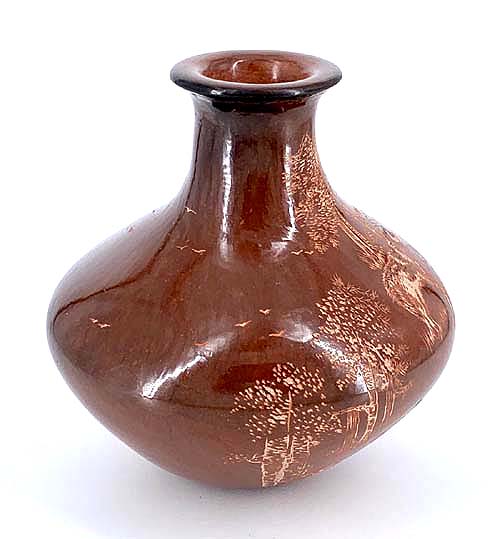 most known for her dark brown jars decorated with intricate sgraffito