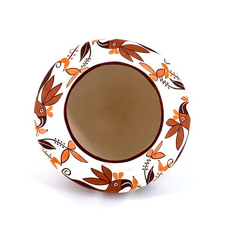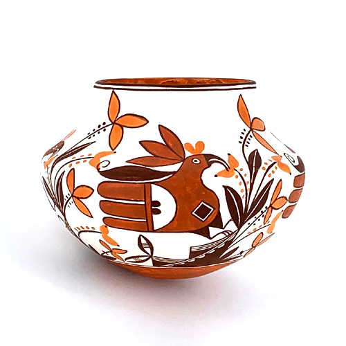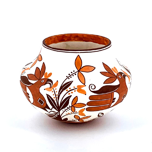 She specializes in miniature versions of 19th century potteries and includes a date on the bottom that refers to the estimated date of creation of the original. Her painting is meticulous, and she is one of the last truly traditional potters at Acoma who strictly adheres to natural methods and materials.