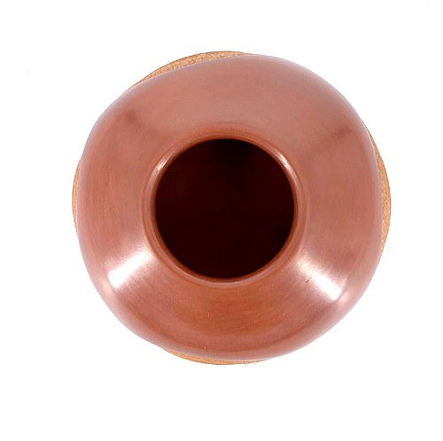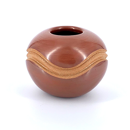 Dominique is an award-winning artist whose designs are unmistakable. We were particularly impressed with the warm, red, highly polished finish of this piece constrasted against the shimmering mica grooves rising and falling along the outer edge of this piece.