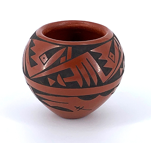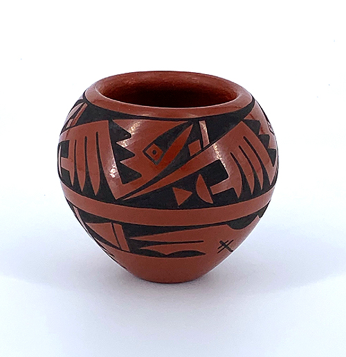 His style progressed from the traditional black-on-black pottery to an innovated two tone, black-on-red, separated by sgraffito low relief carving. He also makes beautiful polychrome pots and presently he specializes in green-on-black pots.