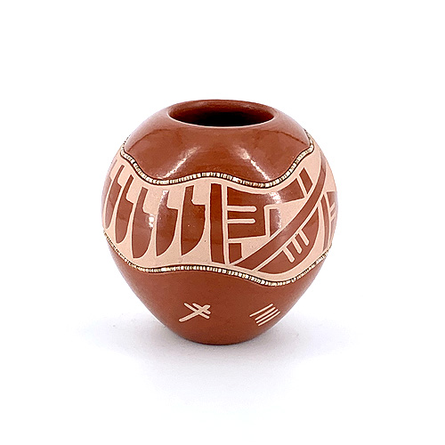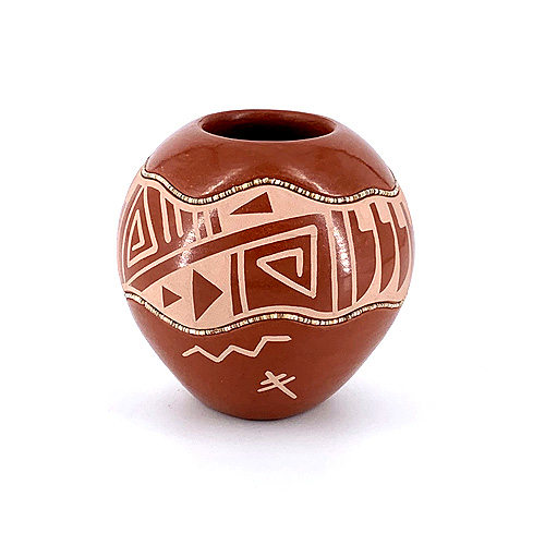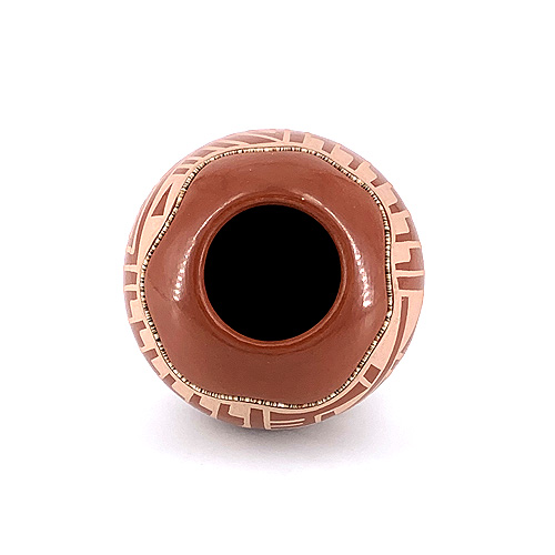 Erik Fender adheres to tradition at San Ildefonso as much as anyone, and yet his work often incorporates modern twists and interpretations. This jar is a great example of his avante-garde approach. The painted designs feature classic Pueblo geometrics separated by popular knife-wing imagery, but the band containing these designs both above and below are fluid and abstract - like the boundaries of a river, effortlessly flowing around the perimeter of the pot and punctuating the overall aesthetic with the heishi-shell accents Erik has become well known for.
