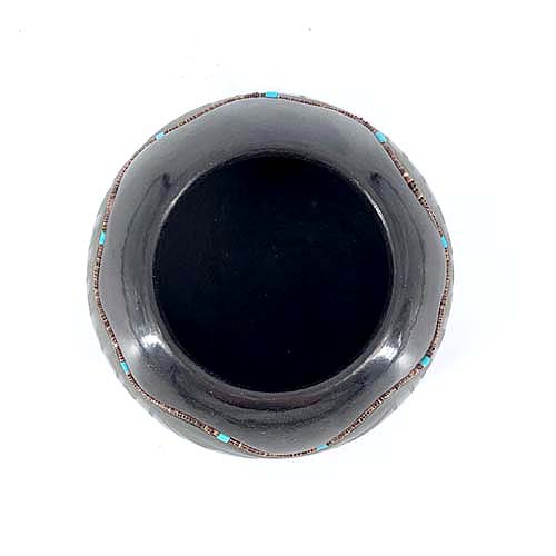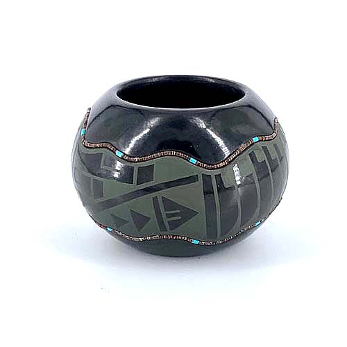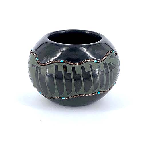 His style progressed from the traditional black-on-black pottery to an innovated two tone, black-on-red, separated by sgraffito low relief carving. He also makes beautiful polychrome pots and presently he specializes in green-on-black pots.