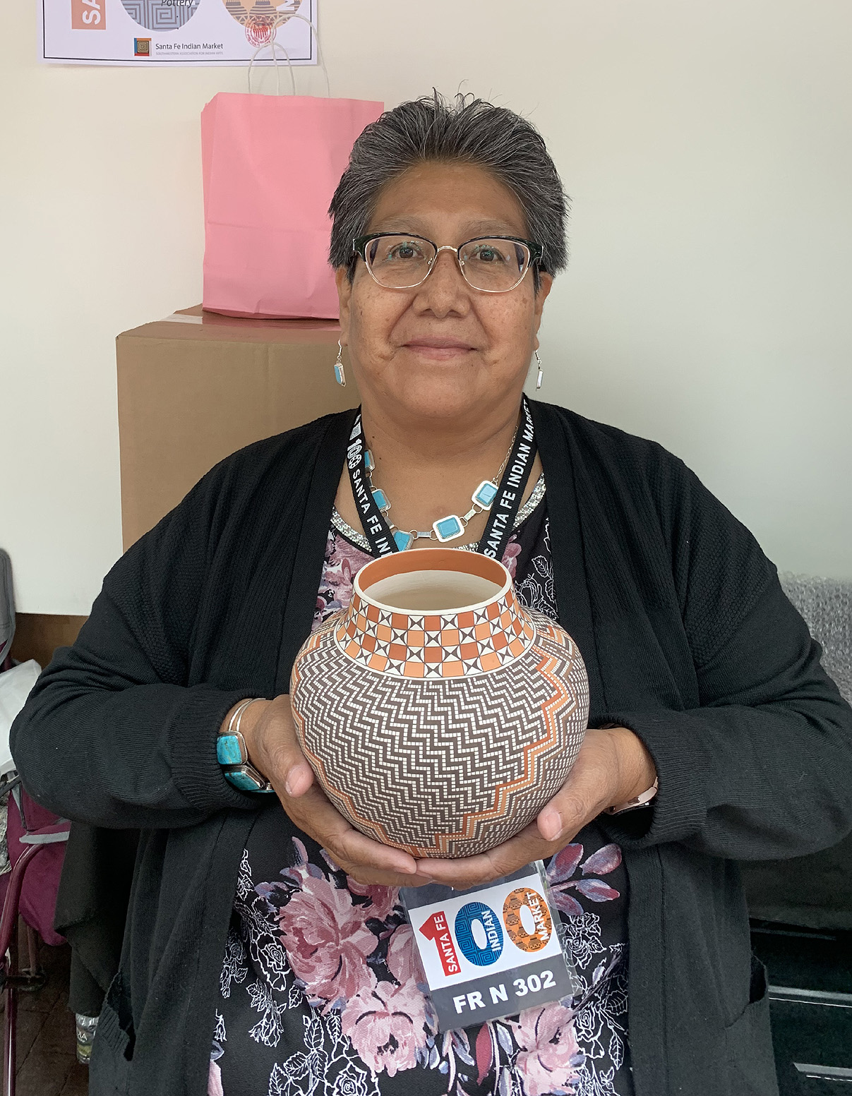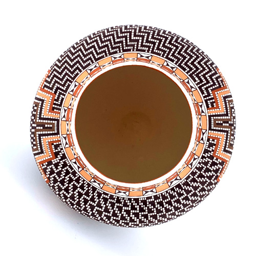 Frederica specializes in contemporary hand coiled pottery with hand painted intricate eye dazzling designs. She fashions a brush from the stems of a yucca plant to paint her eye dazzling designs. She also paints a band on the side of her pottery with kokopelli (god of fertility).