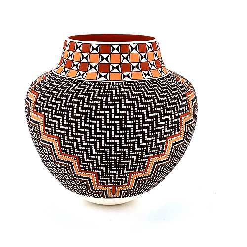 She also paints using different colors of paint so the pottery gives you a unique three dimensional effect. She hand coils a variety of sizes and styles, every one of her pots is a one of a kind work of art; there are no two pieces alike.