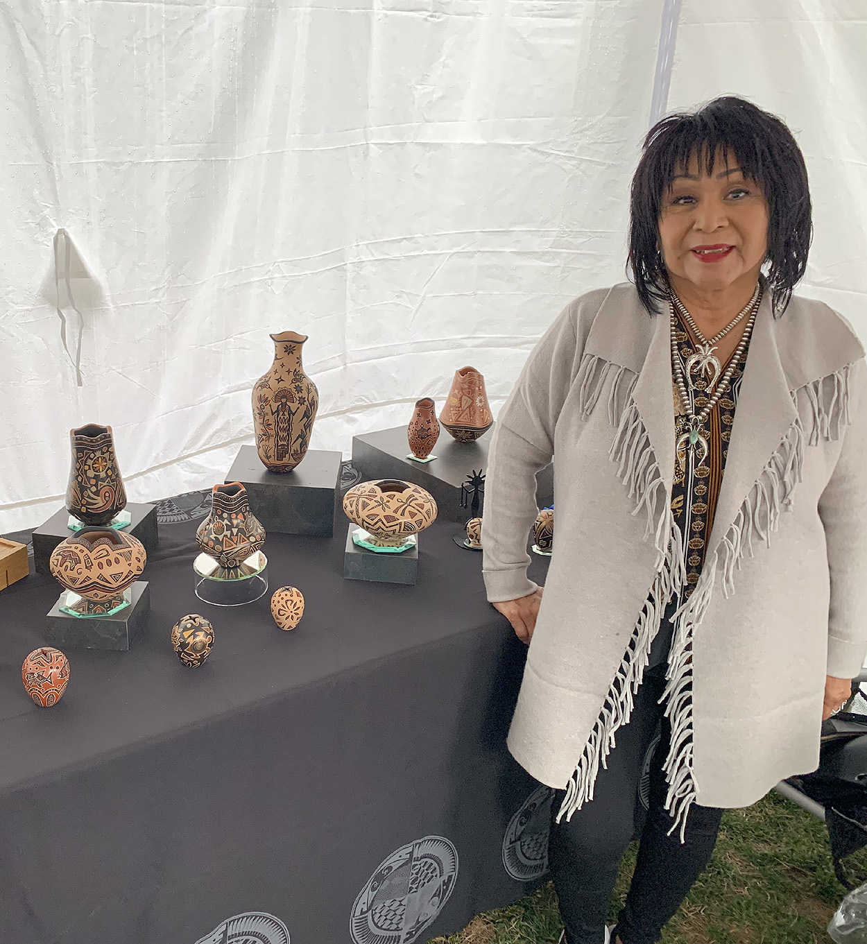 She was taught all the fundamentals of constructing pottery vessels the ancient traditional way of hand coiling, pinching, and firing outdoors by members of the Jemez Pueblo which have been passed down from generation to generation.