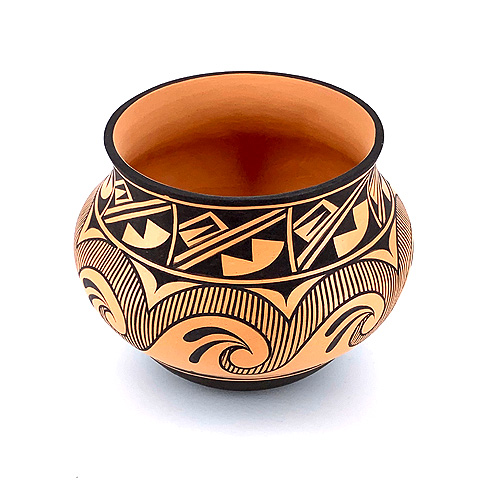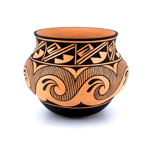 Jamie's favorite shapes are either contemporary (he sometimes makes duck pots) or traditional Hawikuh-revival styles. His favorite designs are a mix of modern fine line and traditional Zuni designs.