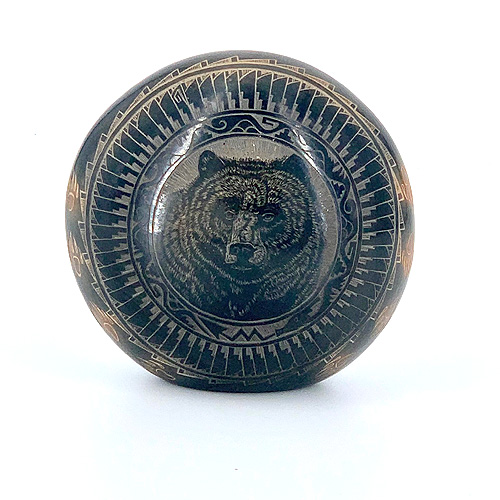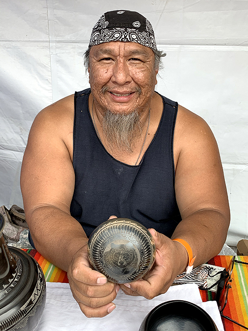 Kevin specializes in the hand coiled black/sienna Santa Clara sgraffito style pottery, almost always with a wildlife theme reflecting his interest in hunting and fishing.