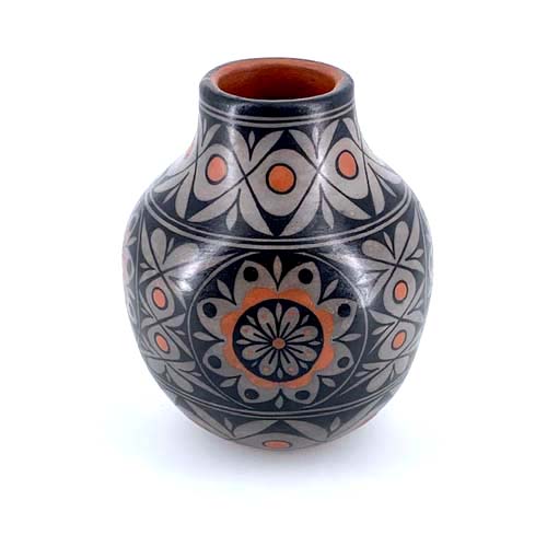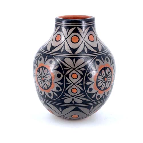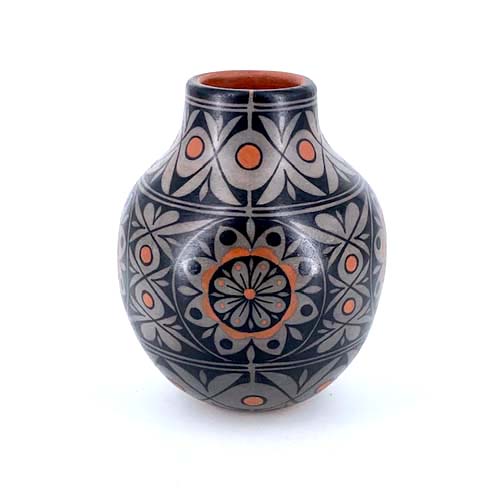 More new work by Lisa Holt (Cochiti) and Harlan Reano (Santo Domingo). Classic black and white with orange accents using traditional Cochiti methods and materials featuring floral designs throughout.