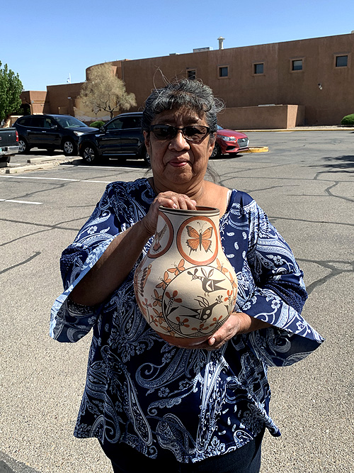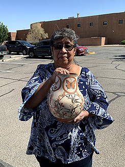 Elizabeth specializes in the handmade traditional Zia pottery with traditional symbols and birds. She digs up her own clay, cleans, mixes, coils, shapes, fires, and paints her pottery the traditional way, with natural colors.