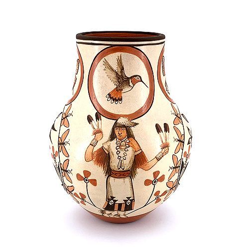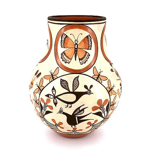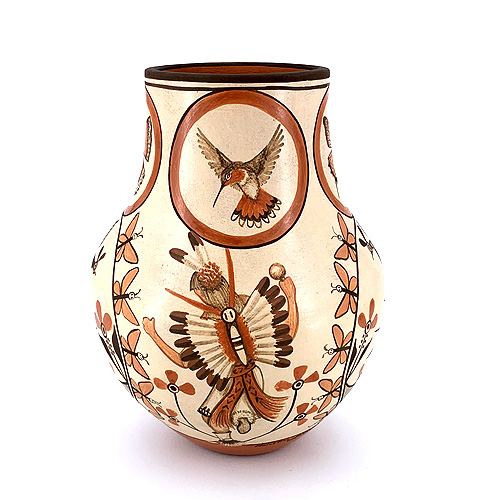 This high profile vase features the elborate painting and detail work of both Marcellus and Elizabeth. A male and female butterfly dancer appears on opposite sides, while traditional zia bird designs appear alternating. Decorative medallions encircle the rim with delicately painted hummingbirds and butterflies, while even more butterfly motifs surround each panel on the pot. There is a lot going on here - but it's perfectly balanced and has a dramatic presence.