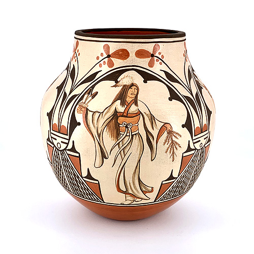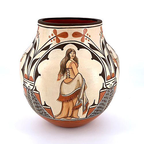 The first and only one of it's kind - Marcellus was inspired to create this piece after enduring the last couple of years separated from people during the pandemic. He commented how the news was fanning the flames of division and how he wished we would all remember we are all related as members of the human race. Accordingly, this work of art depicts four different groups of people - Marcellus has painted maidens in their own regalia from the Asian culture, Latin culture, Pueblo culture, and European culture. It's a stunning vessel in every way.